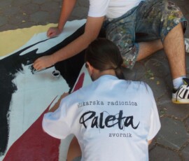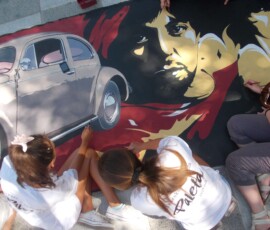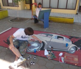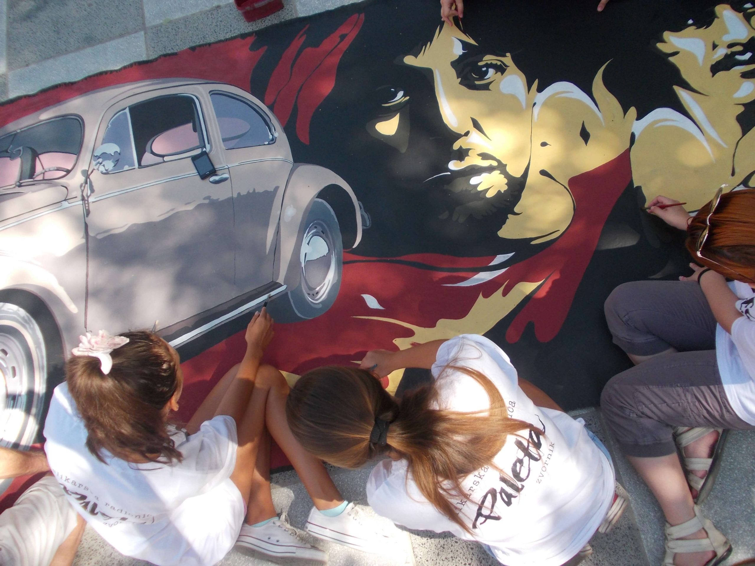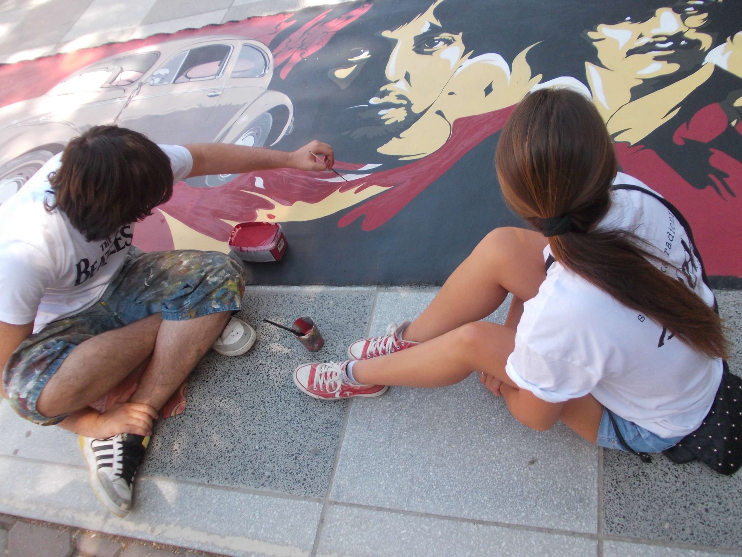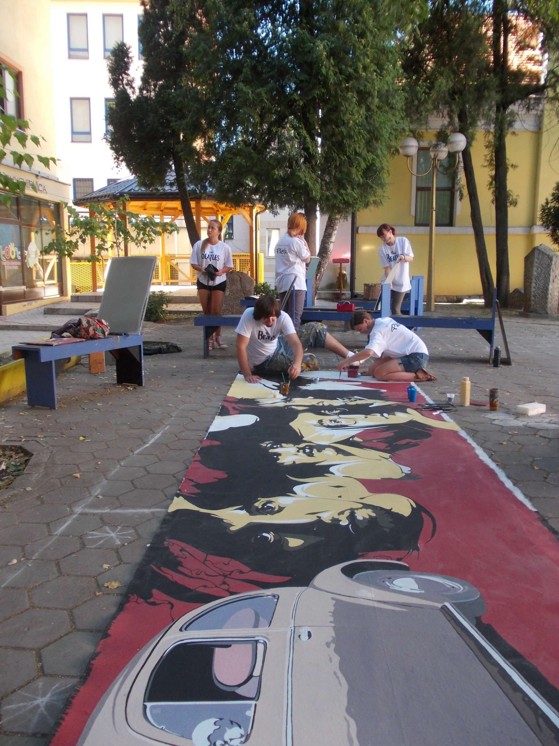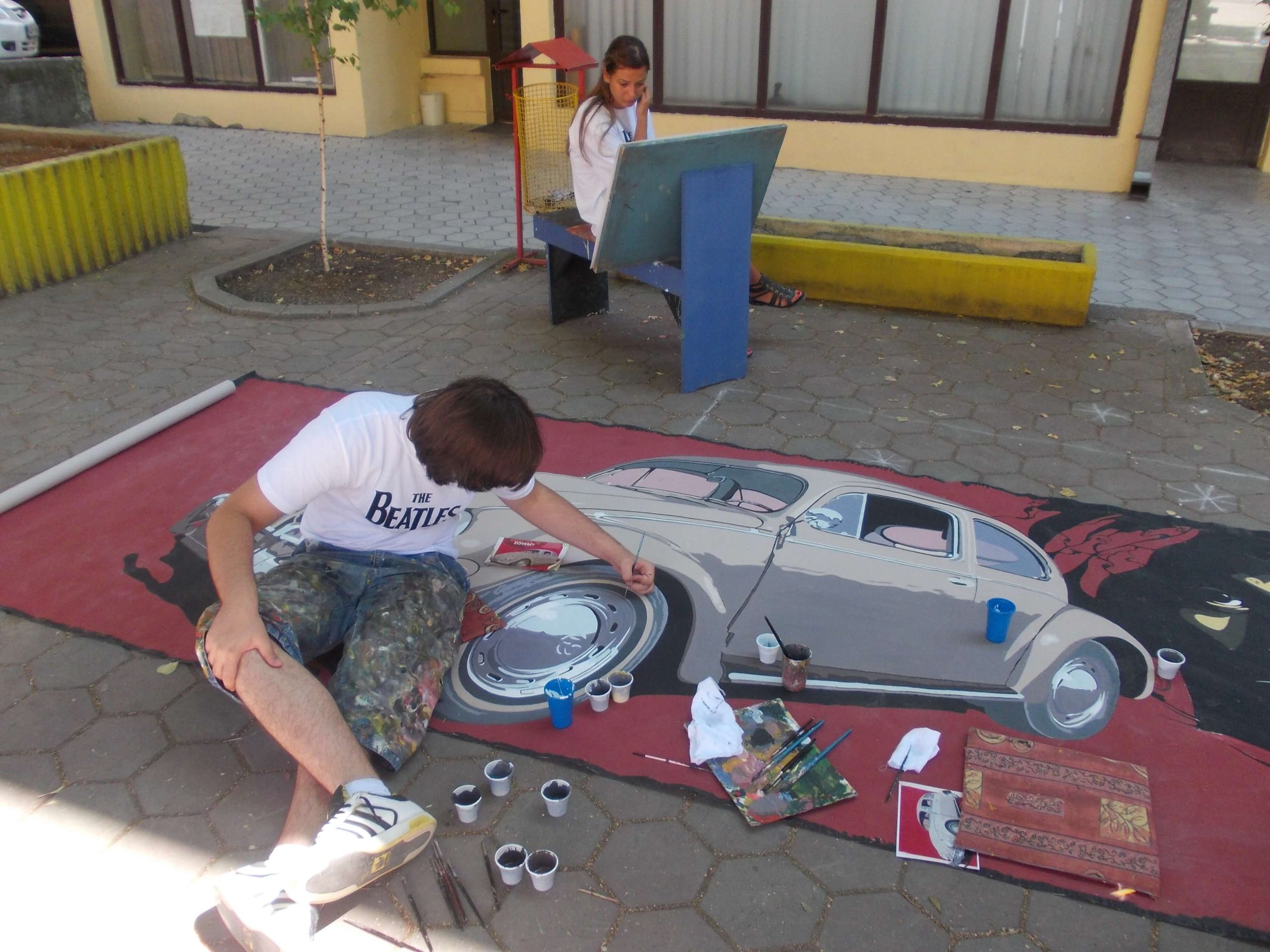 “Hey Beetle, Tell Me How To Call You” was carried out in Zvornik in 2013, as a part of OSCE project “What prejudice cannot see.” The project involved 12 members of the workshop “Paleta.” This piece of art was created by painting canvases on the pavement (Street Art), more precisely in front of the Town Museum where the workshop itself is situated. The project was inspired by Volkswagen’s car “Beetle” and “The Beatles” – the famous rock band from Liverpool. Beetle car is one of the renowned representatives of the hippie movement. It appeared in many movies and popular comic books, such as Dylan Dog. This type of car is considered one of the most popular and best-selling cars of all times. The Beatles were, and probably still are, an iconic rock band from Liverpool. They are widely regarded as the most successful and most recognized band of the rock era.